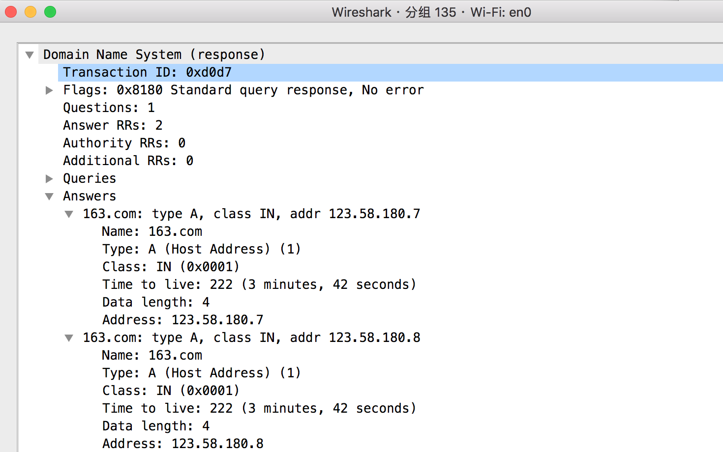 回答资源记录数,在应答包里为 2,说明返回了两条查询结果,你可以在 Answer 字段里看到。