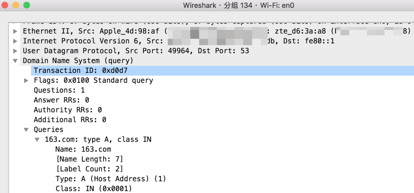 打开 Wireshark 后,使用 ping 163.com 来发起 DNS 解析请求,使用 DNS 关键字在Wireshark 过滤。