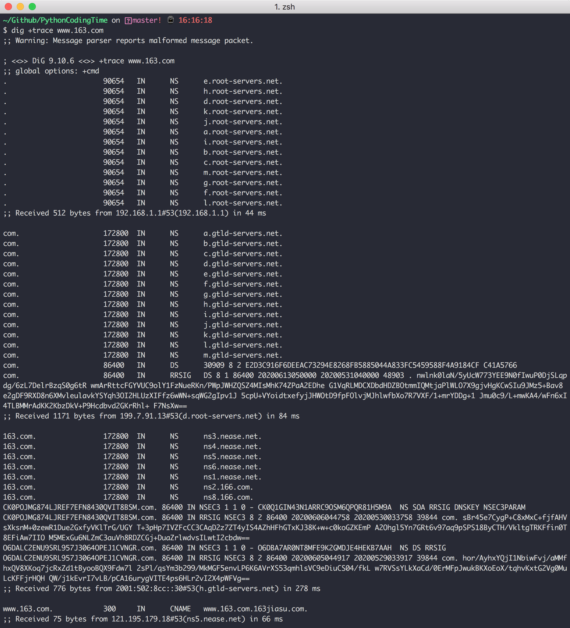 通过 dig (参数:+trace)命令,我们可以看到上面描述的 DNS 解析的详细过程