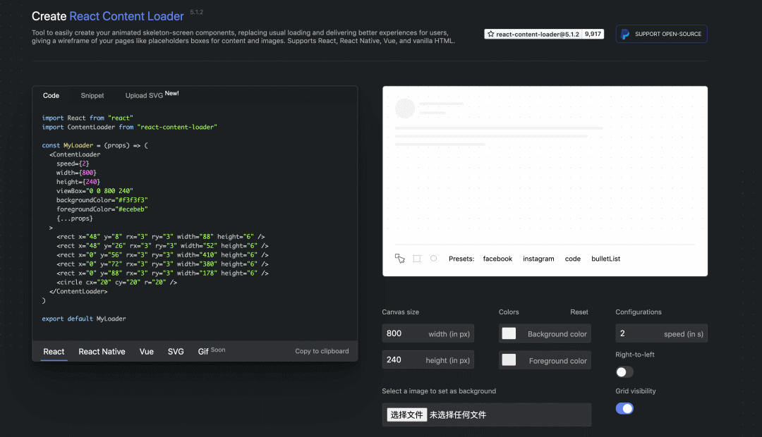 今天要给大家推荐一个标星 1 万的开源库:react-content-loader,它是基于 SVG 支持快速搭建网页骨架屏。