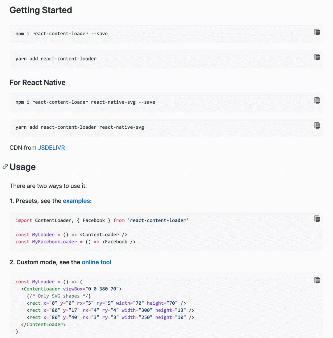 👌 可插拔配置: 有很多的可插拔配置可以选择,详情可查看 http://danilowoz.com/create-content-loader/#gallery ;