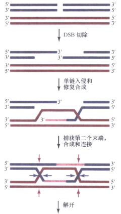 通过退火捕获第二个DSB末端产生重组接合分子,此时两条DNA双链体由异源双链体DNA和两个Holliday连接体联系在一起。