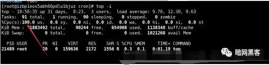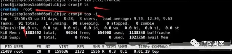 5、去cd /etc/crontab ,删除定时任务,然后top -i,得到如下,cup依然张立在哪里,懵逼