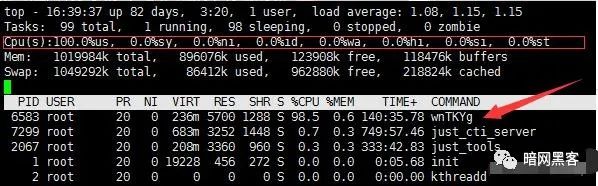 这个叫wnTKYg的进程很诡异,已经把CPU吃光了,上网一查,原来是中了挖矿的马。