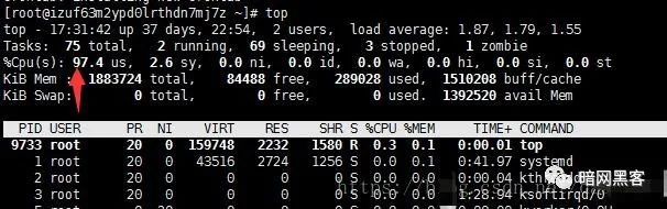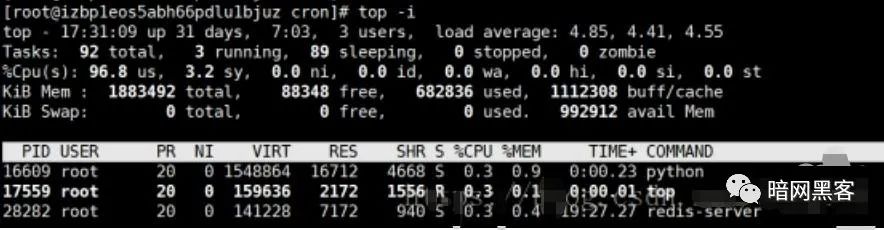 6、然后top 再查看,成功了,然后查阅了资料,说redis 漏洞,果断修改了ssh密码,修改redis的端口,修改了登录数据库密码,一切看起来就是这么简单