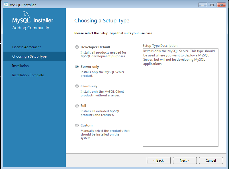3,选“Server Only”,Next, 我只想安装服务器,你也可以选第一个Developer Default,这样Sever和Client的所有组件都会安装。