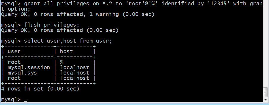 grant all privileges on *.* to 'root'@'%' identified by '12345' with grant option;