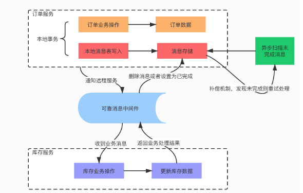 (4)设置异步任务,定时去扫描本地消息表,发现有未完成的任务则重试,保证最终一致性。
