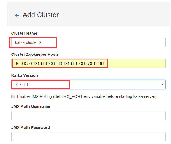 输入集群的名字(如Kafka-Cluster-1)和 Zookeeper 服务器地址(如localhost:2181),选择最接近的Kafka版本(如0.8.1.1)
