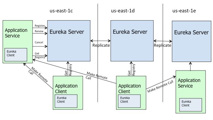 从图中可以看到,我们的服务(图中Application Clinet与Application Service)要使用Eureka就需要集成它的SDK(图中Eureka Client)。图中的Eureka部署在了三个异地机房,也就是说Eureka是支持多中心部署的。