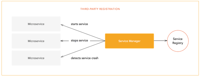 如图,第三方注册就是指有一个“服务管理器”(图中的Service Manager),这个“服务管理器”会去管理所有的微服务和进程,以轮询或其它方式去检查有哪些微服务实例正在运行,会将这些微服务实例自动更新到服务注册中心。这是目前比较常用的方式,例如Eureka就是采用这个模式。