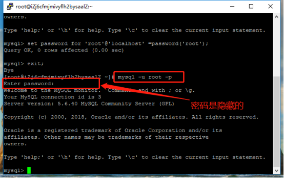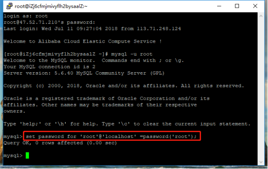 进入之后光标前面会有mysql的字样,证明我们已经进入了MySQL。我们设置一下我们的密码吧,执行下面的指令即可,password(‘root’);这里面的root就是你要设置的密码。