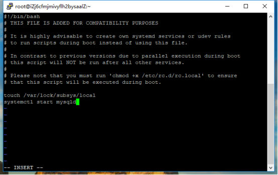 我们先执行这条指令vi /etc/rc.local,会变成一个编辑区域出来,我们将service mysqld start添加下去,如图所示,最好保存关闭就好了。