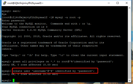 我们也可以通过下面的指令创建新的用户来分配权限等。username是用户名,%是所有IP地址,如果输入的是IP地址,就规定只有改IP地址才能使用,password是登录密码。