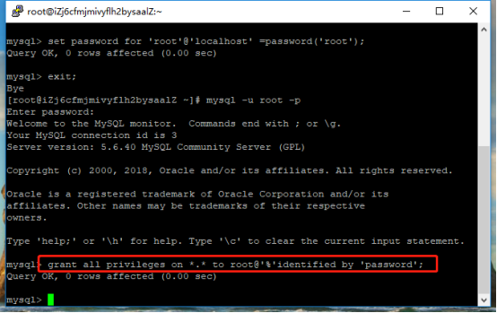 指令:grant all privileges on *.* to root@'%'identified by 'password';