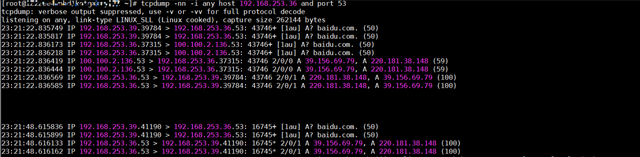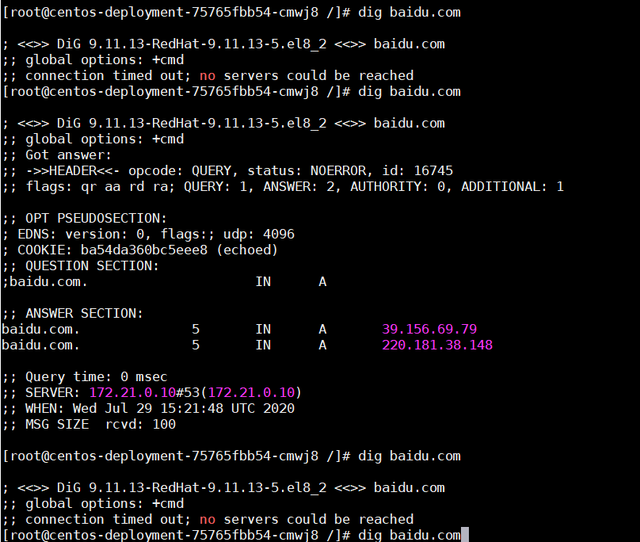 正是因为上述kube-dns的session的保持时间设置了10800,导致域名解析的请求一直都是寻找坏的coredns POD(如coredns也就是被解绑后重新绑定辅助网卡的那台机器上的coredns),所以客户侧在解绑操作后续一直没有无法进行正常解析,类似于下面的现象: