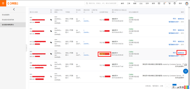 跳转至安全组界面---选择集群的安全组实例id---安全组内弹性网卡--搜索刚刚查找的弹性网卡--解绑实例