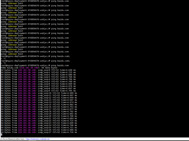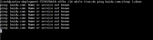 网卡在被up后,再次进入pod进行测试,会发现解析就可以正常运行了。