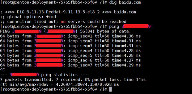 1)接到客户反馈 Kubernetes 托管版集群出现网络问题,电话沟通后授权进行查看:Pod 网络通畅,域名解析出现异常;(ping IP 可通,但ping域名不通)