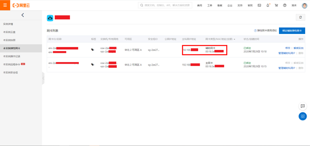2)解绑完成之后再次将辅助网卡绑定至原有实例;