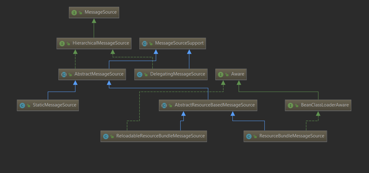 上图的messageSource是应用程序上下文对象(本文创建的是GenericWebApplicationContext实例),该messageSource对象会调用ResourceBundleMessageSource实例获取具体信息。