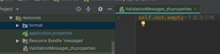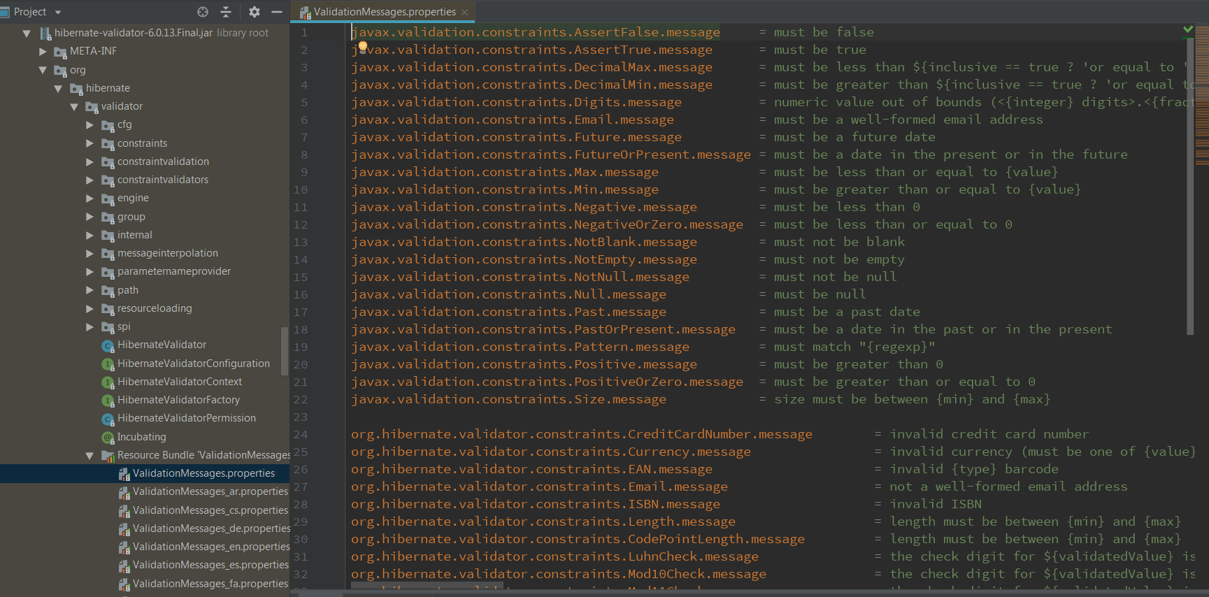 另外hibernate-validator还会加载默认的校验资源文件,名称是:org.hibernate.validator.ValidationMessages。可以看到,默认的校验资源捆绑文件包含了不同区域的信息的配置。
