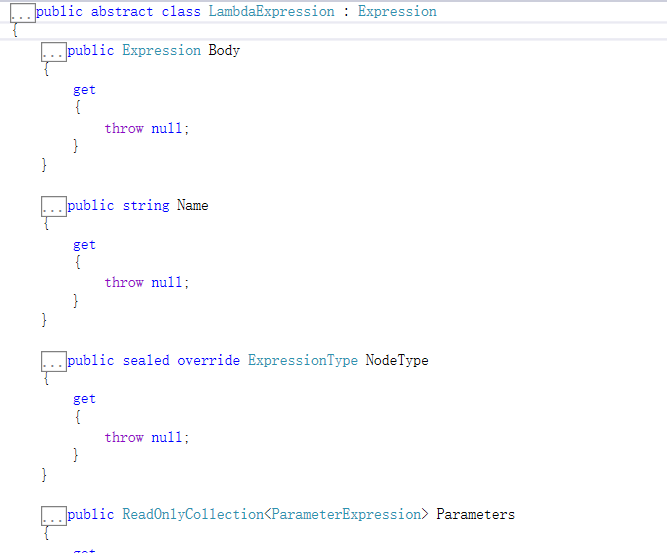 4、我们继续进入LambdaExpression,我们看到了一些属性(这些就是我们lambda的组成的方法和属性),但是最终还是看到继承了Expression