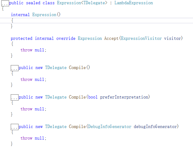 3、我们进入Expression一看究竟,我们可以看到Expression<Func<TSource, bool>>里面有一些方法(后面会慢慢道来),最终继承LambdaExpression