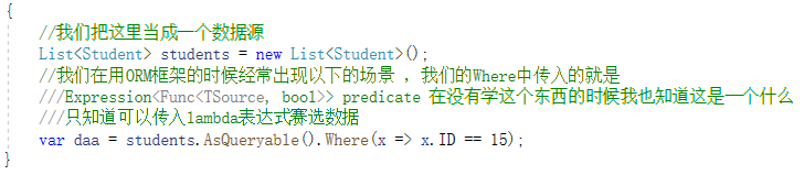 3、如果你觉得,还不够我们就写几个实例Expression<Func<Student, bool>> expression = x => x.ID.Equals(15);