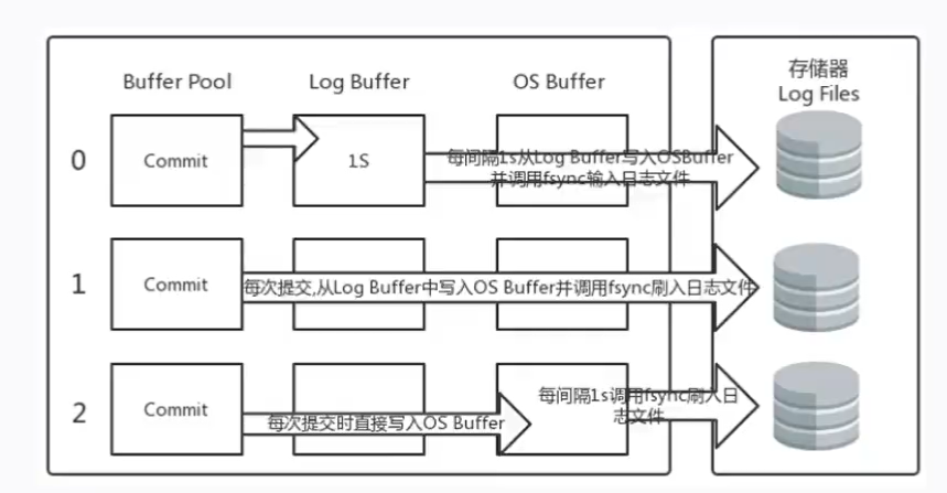 - innodb_flush_log_at_trx_commit 设置commit时如何将log buffer中日志刷log file中 (值0、1、2)默认1