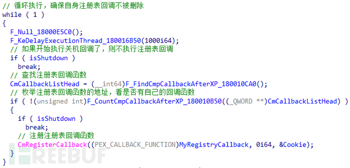 除此之外,病毒还会循环枚举注册表回调函数的地址,若检测到被删除,则会再次注册回调函数,这么做为了防止用户利用pchunter之类的ARK工具对回调函数进行删除操作,使病毒难以被手动清除。但如果是病毒程序自身升级需要修改相关的注册表项时,则会利用开关标记来暂停对相关注册表项的保护。