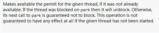 unpark会唤醒被park的指定线程。但是,这里要说明的是,unpark 并不是简单的直接去唤醒被park的线程。看下JDK的解释: