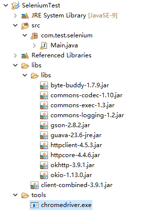 6.在项目文件夹下分别建立两个文件夹,libs和tools。将selenium-java-3.9.1.zip和chromedriver_win32.zip分别解压,然后将selenium-java-3.9.1文件夹内的文件复制到libs下,将chromedriver.exe复制到tools下,目录图如下