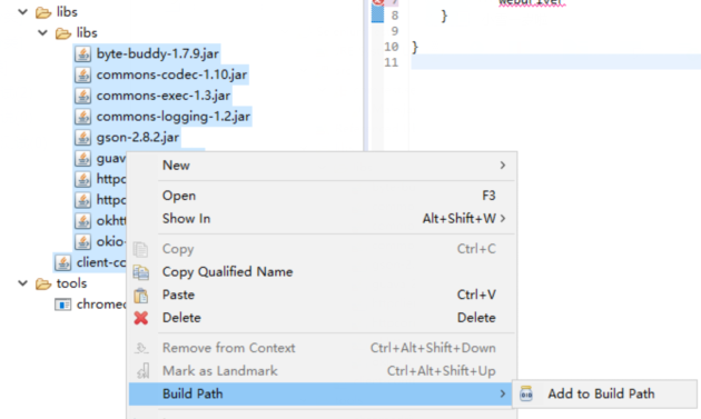 7.将libs文件夹下的jar包全选,右键-build path-add to build path