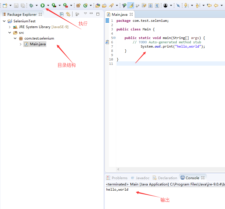 4.main函数增加一行代码,System.out.print("hello,world!");