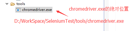 注意,D:/WorkSpace/SeleniumTest/tools/chromedriver.exe是chromedriver.exe存放的位置。即我们tools文件夹下,chromedriver.exe的位置。