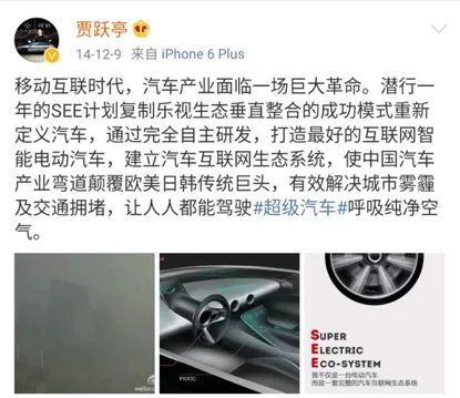 可他们不知道,贾跃亭的野心正在慢慢扩大,2014年时任乐视网董事长兼CEO的贾跃亭创立了FF(法拉第未来汽车公司)并在硅谷组建了核心研发团队,12月,贾跃亭发了一条微博,乐视要打造最好的互联网智能汽车。