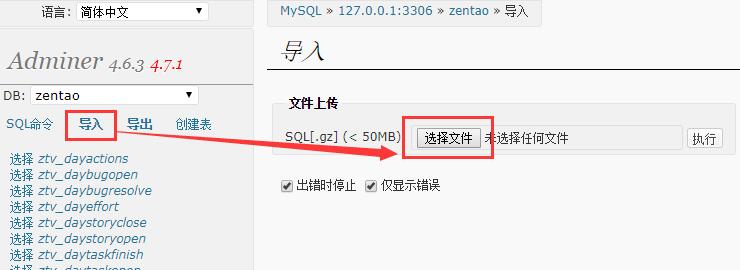 导入数据库:/opt/zbox/bin/mysql -u root -P mysql端口 -p 要导入的库名 < XXXX.sql (比如:/opt/zbox/bin/mysql -u root -P 3306 -p zentao < zentao.sql)