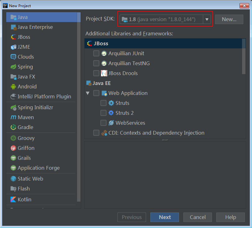最新安装的IntelliJ IDEA 2018.1编译器,创建Java Project,并选择之前安装好的Eclipse配置的JDK,如图所示: