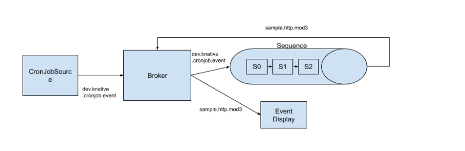 我们将创建以下逻辑配置。创建一个 cronjobsource,向 Broker 提供事件,然后创建一个 filter,将这些事件连接到由3个 step 组成的 Sequence 中。然后,我们获取最后的step返回结果事件发送给给Broker,并创建另一个 Trigger,该 Trigger 随后将显示事件结果。