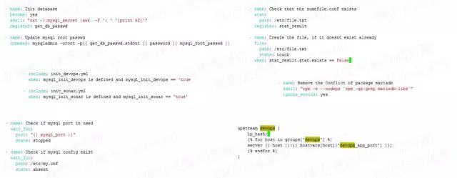 场景:大多数情况,我们只需要把配置文件中某些需要变更的变量抽成配置即可,但像nginx这种需要动态配置或相对复杂的配置文件,就可能会用到Jinja2强大的模板自定义的能力了,最后这张图是安装DevOps集群环境是根据group分组中的ip以及组变量中的端口配置动态生成nginx config文件的一个片段。