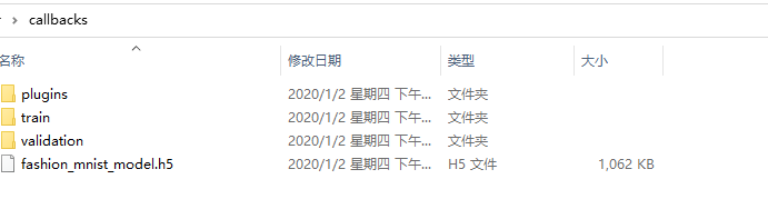 加上回调函数的训练函数,训练完模型之后,会发现指定的文件夹下生成输出模型文件、train和validation文件夹下是TensorBoard的文件:
