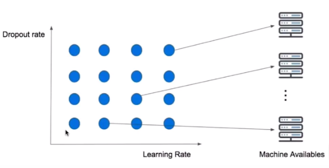 如图,dropout设置四个值,learning rate设置四个值,相互组合形成16个值,然后把16个值放到不同的机器上并行执行,找到最好的组合方式,这就是网格搜索。