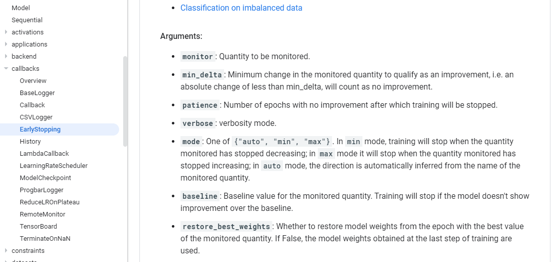 看它的参数,最主要的是前三个,monitor是我要关注的是哪一个指标,一般情况下我们关注的是验证集上的目标函数的值,min_delta是一个阈值,我这次训练和上次训练的目标函数值的差距是不是比这个阈值要低,如果比这个阈值高的话,就不用earlyStopping,如果比这个阈值低的话可能就要考虑把它提前停止掉,patience是前后两次目标函数值的差距比mind_delta小的时候,我连续多少次发生这样的情况,我就要把它先关闭掉。