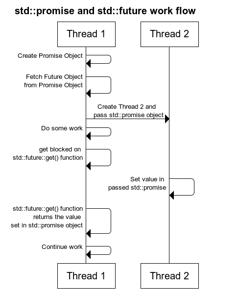 - 线程1初始化一个promise对象和一个future对象,promise传递给线程2,相当于线程2对线程1的一个承诺;future相当于一个接受一个承诺,用来获取未来线程2传递的值