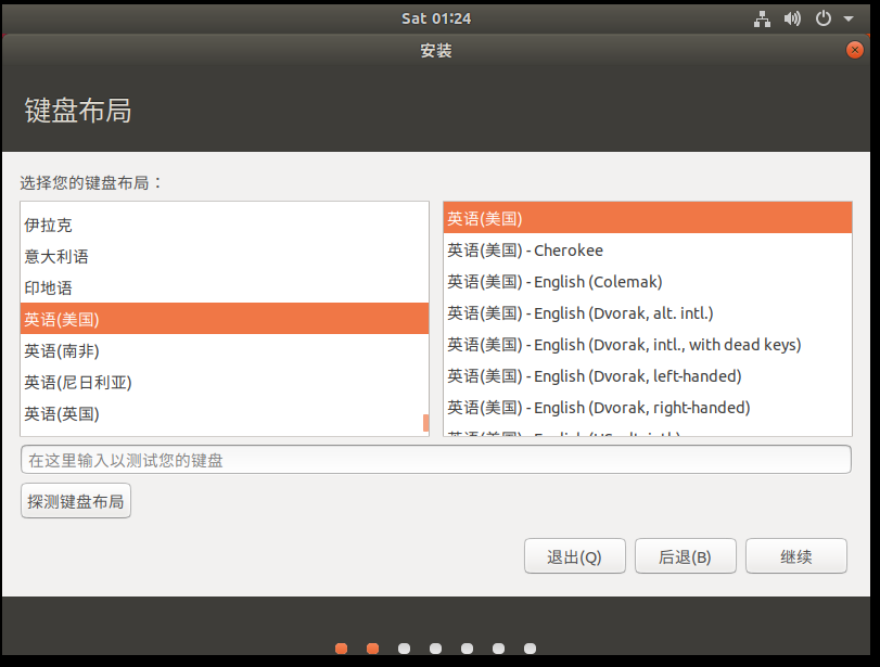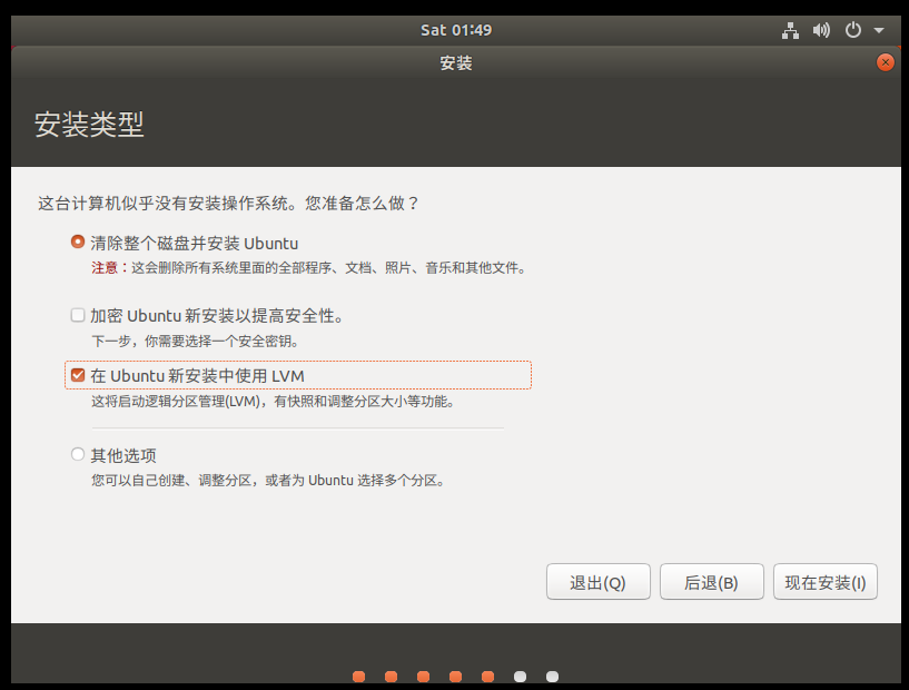 分区就选择了清除整个磁盘并安装Ubuntu和使用LVM(这个相当于自动分区),下面其他选项是手动分区,这里我没有使用手动分区是因为我选择手动分区下一步的时候无法显示下面的按钮,可能是Vmware的问题,现在是体验Ubuntu,就没有深究,直接选择自动分区了。
