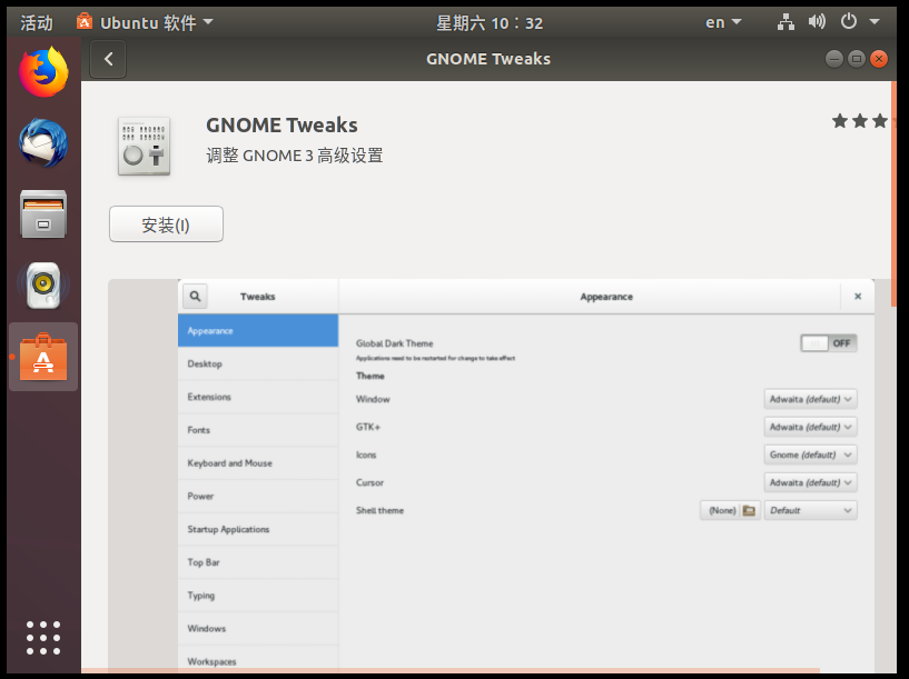 先是安装一个gnome tweaks tool,我在软件中心只搜到这个,我不知道是不是这个。安装完成后还是有一个优化图标在软件列表上的,就可以进行主题和图标的优化。