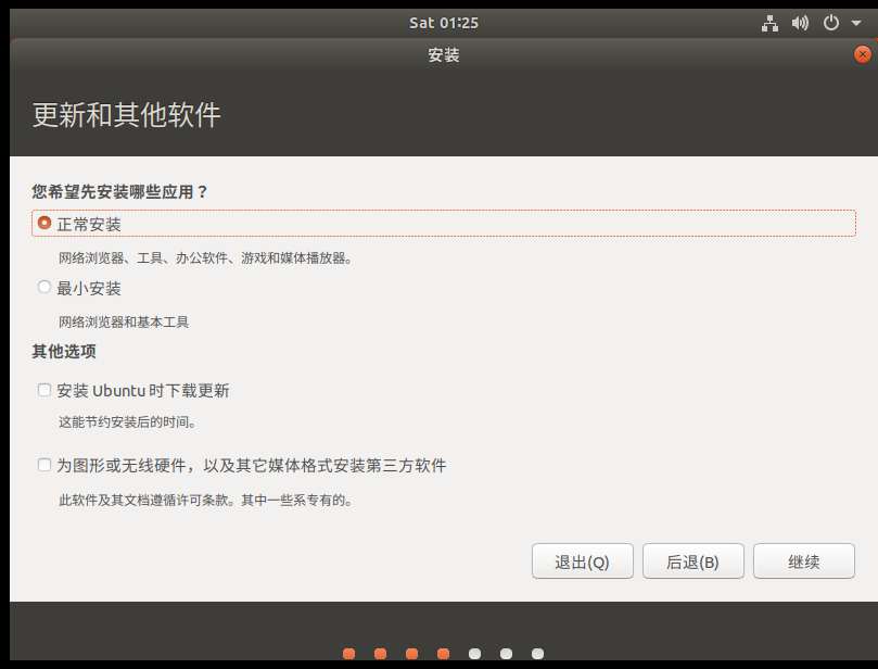 选择正常安装。个人想自定义自己想要的软件就选择最小安装,等系统安装完后自行选择安装需要的软件。我这里体验就直接选择正常安装。
