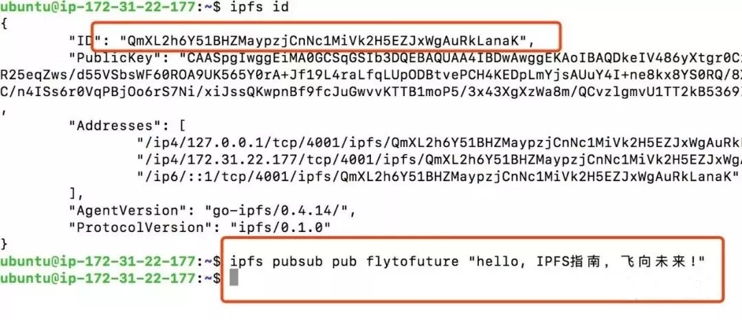 ipfs pubsub pub flytofuture "hello, IPFS指南,飞向未来!"