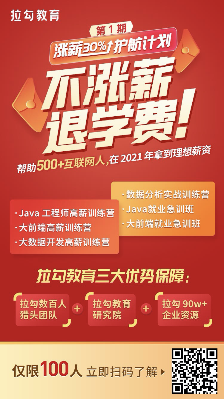 现在,参与拉勾教育推出的#涨薪 30% 护航计划#,课前签订涨薪协议,不涨薪立刻退学费。6 个月 的时间,帮你夯实知识点、丰富项目经验!